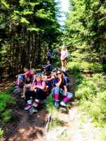 Čas za preobuvanje in smo krenili. Po nekaj deset metrih smo z ceste zavili v gozd in se začeli vzpenjati. Kar nekaj časa smo hodili v varstvu gozda, tako da nas sonce ni preveč motilo.